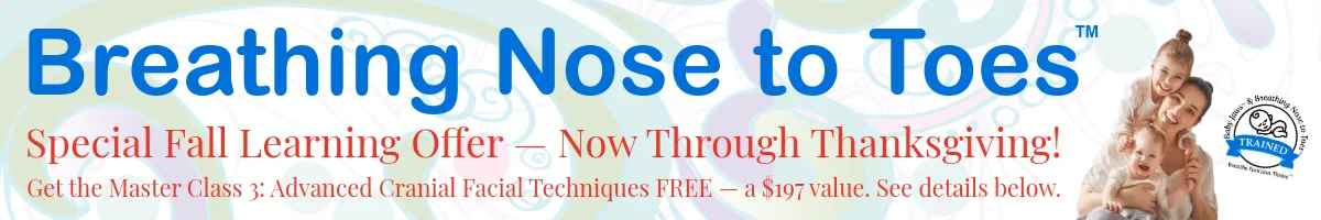 Enroll in the complete Baby Jaws & Breathing: Nose to Toes course set and receive Master Class 3: Advanced Cranial Facial Techniques FREE — a $197 value.