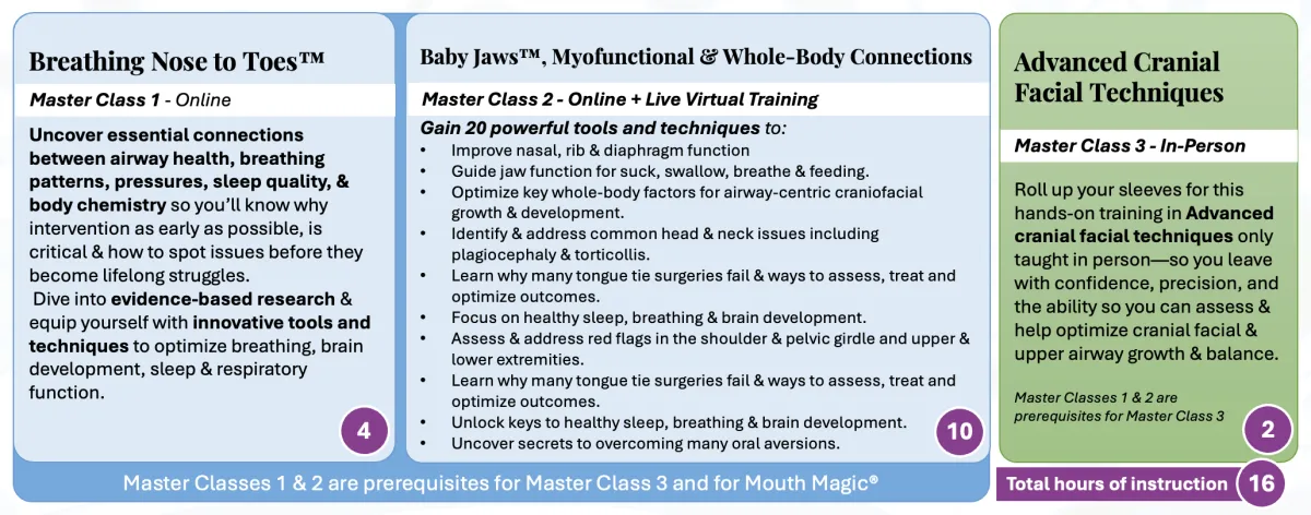 Here’s where we roll up our sleeves. In this hands-on training, you’ll master advanced cranial facial techniques only taught in person—so you leave with confidence, precision, and the ability to integrate every Breathing Nose to Toes™ skill into your practice. Note that this in-person Master Class is taught at the same locations and times as the Mouth Magic Master Class 2. Check out the Mouth Magic information page for details.